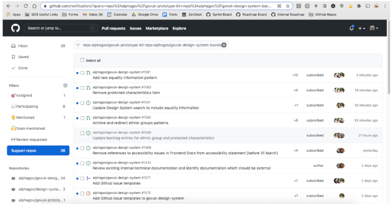 There is a view you can set up in GitHub which will notify you when new issues / PRs / comments are added to a repository. This could be useful when you are on support.